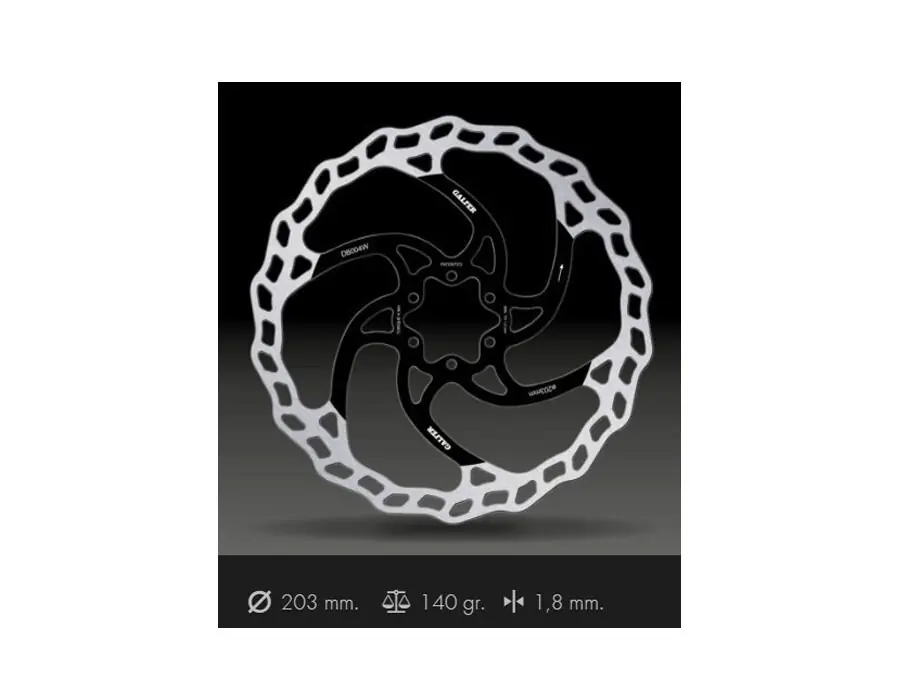 Galfer brzdové kotuče.Pevné brzdové kotouče Galfer Fixed Disc Wave.Tloušťka kotouče 1,8mm.Průměry kotoučů vybírejte v roletce – 160mm, 180mm, 203mm.Uchycení 6ti šrouby.Disc Wave kotouč je vyříznutý laserem a vyrobený z nerezové oceli s vysokým obsahem uhlíku.vysoký brzdný výkon bez „uvadání“tichý chod bez vibracínižší rotační hmotnostzvýšená odolnost vůči vysokým teplotámochrana proti korozivysoká efektivita za sucha i vlhkavhodné pro všechna odvětví cyklistikytloušťka kotouče 1,8mmvyrobeno ve Španělskuhmotnosti:160mm 99g180mm 120g203mm 140g