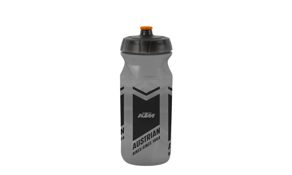 Plastová láhev KTM, průhledná s velkým otvorem pro čištění a plnění, objem 650 ml.