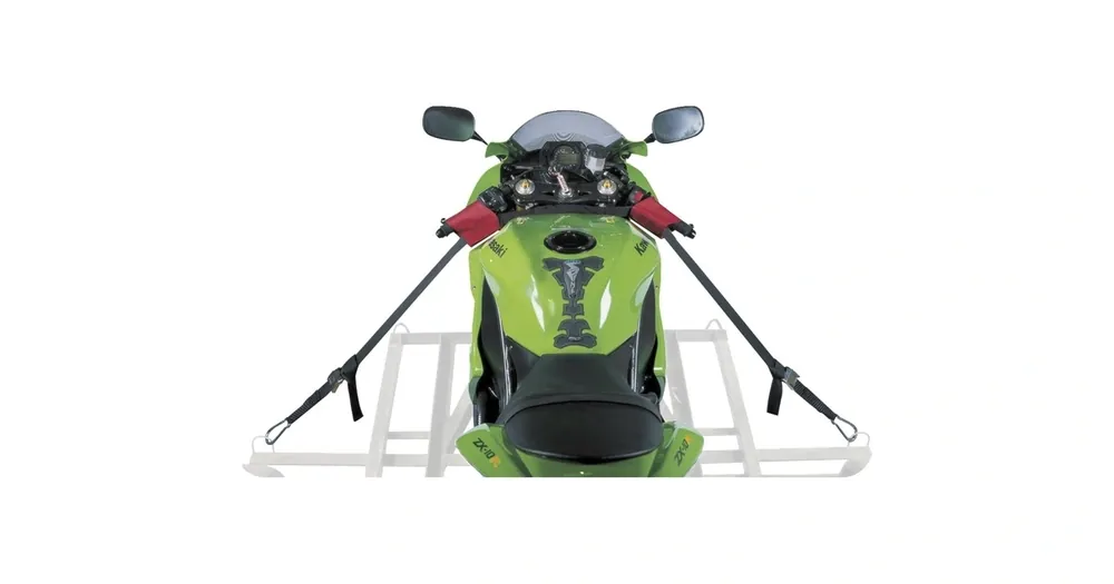 Pevnostní nylonový popruh šířky 38 mm s nastavitelnými přezkami Karabiny na koncích popruhů pro přikotvení k podlahám přívěsů apod. Fleecové potahy pro ochranu laku Můstek pro spojení popruhů mezi řídítky pro maximální vypnutí soustavy popruhu Použitelné pro zajištění většiny motocyklů, s…